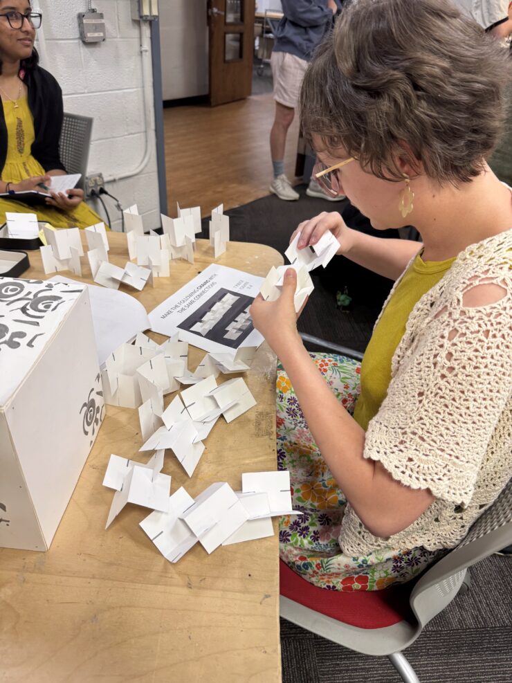 For the first part, we had to design two arch-like modular structures that cross over an eight inch cube. What is a modular structure? It’s a formation created from identical pieces called “modules”. For this project, the modules were to made from Bristol board and had to be absolutely identical, from the overall shape to every single cut. The modules were assembled using joinery, without any external adhesives, and the final structure had to stand on its own without touching the cube at all.