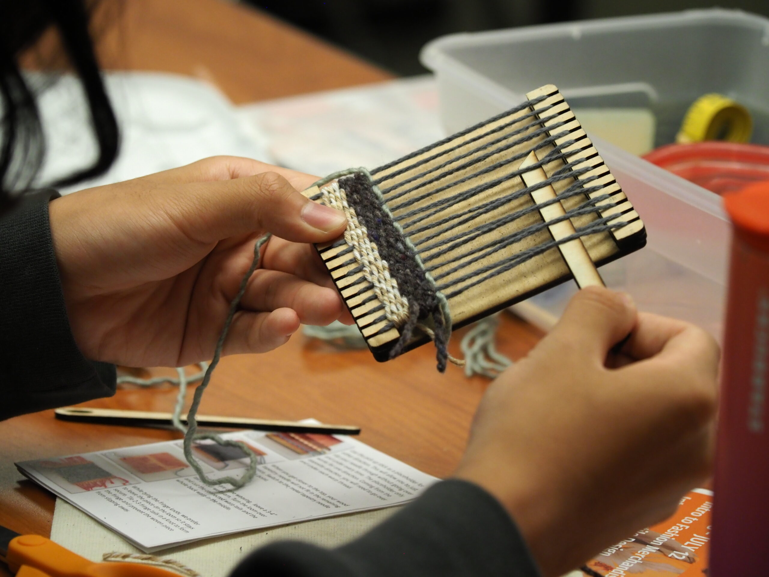 The students and current teacher of Fabric, Fashion, and the Future, Mrs. Rose Lambright were eager to get a chance to make a woven textile. Using small handheld looms and large wooden needles, Regina demonstrated the fundamentals of warp and weft yarns and guided students to create their own textile designs.