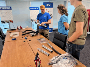 People are surrounded by textiles and use them every day, often without realizing it. From brushing their teeth in the morning (toothbrush) and showering (towel, washcloth, and loofah) to getting dressed (clothing), to driving their cars (tires, upholstery, sound absorbing materials, airbags, seatbelt, floor mats, and engine systems protective components, composite car panels), and cleaning (vacuum cleaner bags, wipes, rags) textiles play a role in the often mundane tasks of life. They also play a role in more exciting events, such as wound care (bandages, cleaning wipes), medical necessities (gowns, drapes, hernia mesh, artificial arteries), and in the sports world (netting at golf courses, soccer nets, lacrosse stick netting, tennis ball felt, performance apparel and footwear). The average American uses about 80 pounds of textiles a year, often unnoticed. The textile industry needs people to design, test, produce, and source materials for these applications, but has struggled to find young people to enter the industry. In an attempt to introduce young people to the textile industry, faculty in the School of Design & Engineering at Thomas Jefferson University collaborated with personnel at Tenneco’s Systems Protection Group in Exton, PA, to set up a shadowing program for two high school students for two days in July 2025. The students, a rising senior and a rising junior, from Twin Valley High School shadowed different employees of Tenneco’s Systems Protection Group in Exton, PA. These students learned about textile engineering, the process of making products from fibers, yarns, and fabrics, and mechanical engineering in the form of modeling material behavior, as well as quality control processes and the relevance of intellectual property in regards to development of processes and products. Feedback from the students was positive, they came away from the experience with a better understanding of textiles and the processes involved in making them. This collaboration between industry and academia to expose young people to textiles was deemed a success, and the university will look at expanding this program with Tenneco and industry contacts in other areas in the future.
